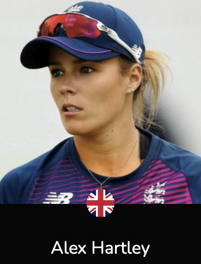 Alex Hartley was born in Lancashire, England and has represented England and numerous domestic teams in England and Australia. Alex co-hosts her podcast called No Balls with England teammate Kate Cross. Alex was part of the BBC Test Match Special team for the 2020 ICC World Cup.